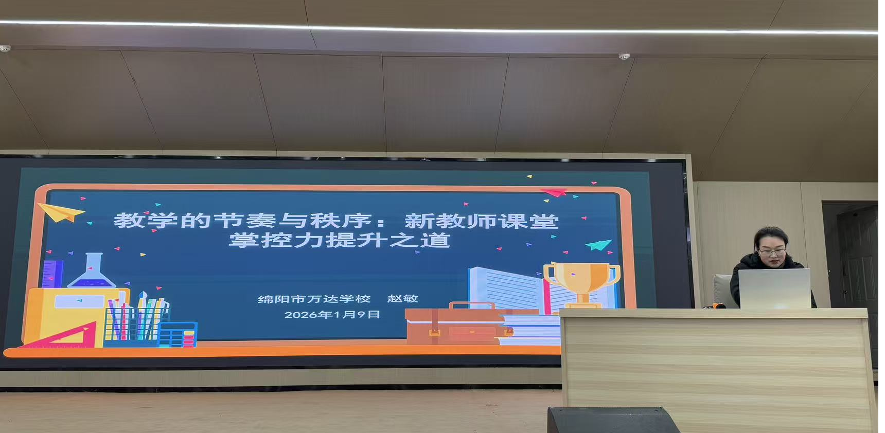 1月9日的讲座由四川省“四有”好老师,绵阳市师德标兵,优秀教师,小学语文骨干教师,绵阳师范学院“四川省卓越教师培训计划”实践指导教师——万达小学赵敏老师主讲,赵老师以《教学的节奏与秩序:新教师课堂掌控力提升之道》为题,基于二十年一线经验,针对新教师常见的教学节奏失衡、管理乏力等问题,结合真实课例提出具体策略,帮助实习生理解课堂节奏对教学成效与师生关系的双向影响。